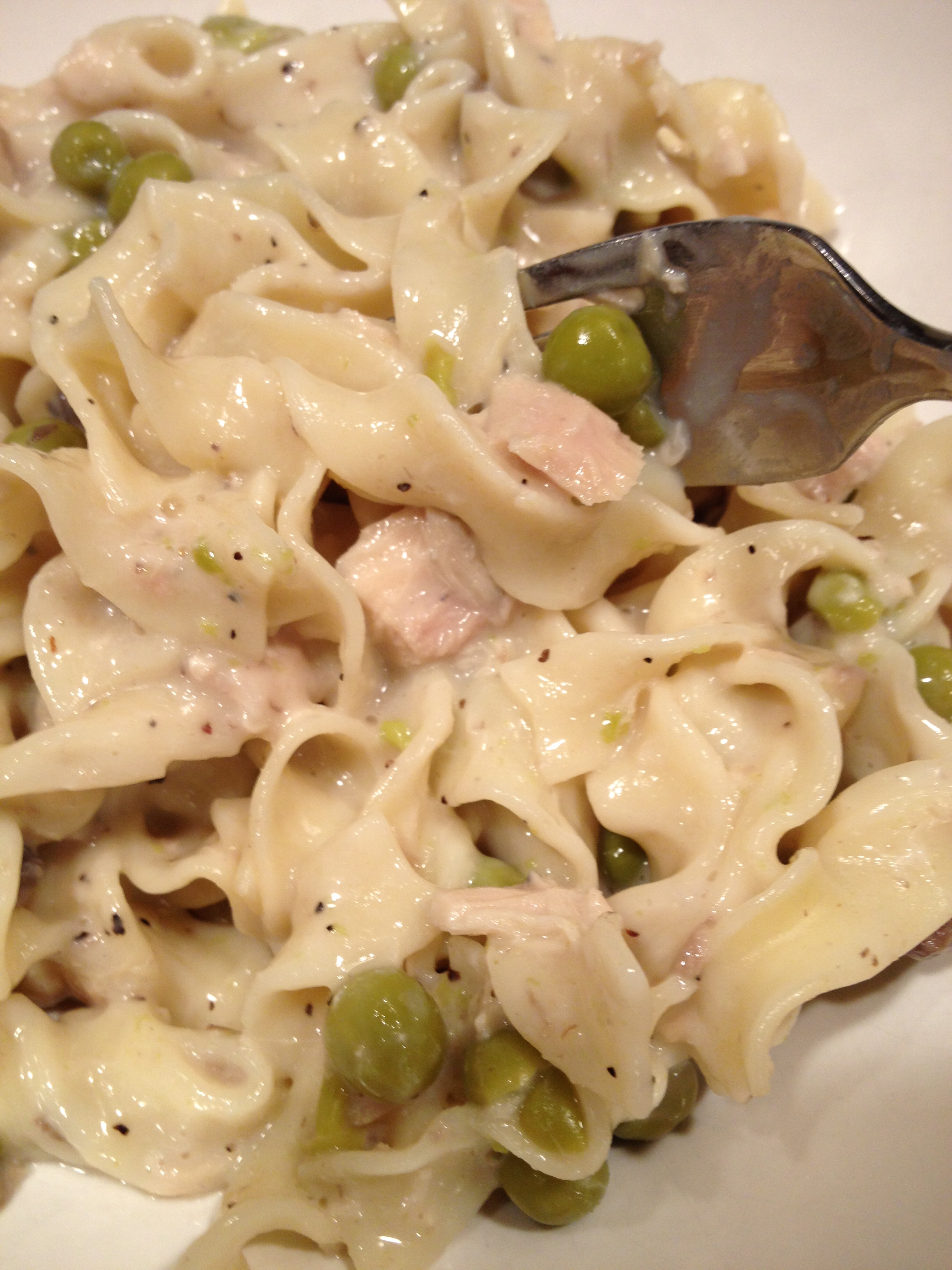 take your wok (or equally large non stick skillet) and give a swirl of olive oil or a pat of butter. open all of your cans, drain where needed, etc. -turn your heat to medium high. Add your mushroom soups, and take one of the soup cans and fill it 3/4 full with milk (i use skim or 1%) and add into pan. stir well to combine. Add in a 1/4 tsp of salt and a 1/4 tsp of pepper and stir well. (add more pepper later once all combined.) Add in your cans of drained tuna, breaking up the pieces a bit with the spoon or the back of your spatula. Add peas, stir. once all combined, bring up to bubbling. Add the noodles, (if they are all stuck from sitting there, run under hot water and shake well – then add them) and cook over medium heat for maybe five to ten more minutes, stirring occasionally. THAT IS IT! Add more salt and pepper to the top if desired, i like to hit it with cracked pepper at the end once it is ready to serve, i think it looks so pretty against the white noodles. turn it out to a serving platter or bowl if desired, or serve straight from the wok. butter bread encouraged. Enjoy a classic… heck, go watch the Duke boys.